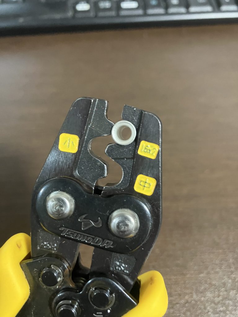 多少引っ張っても動かなくなります。固定した状態で、圧着工具でリングスリーブをほんの少しだけ挟みます。完全に圧着してしまわず、つぶさない状態で止めておくイメージです。