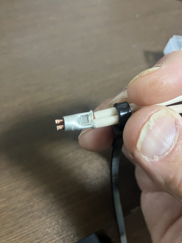 芯線が曲がったまま無理やりリングスリーブに通そうとすると、力がいるし、うまく入らないし、位置もズレやすくなります。面倒でも、まずまっすぐに整える。これだけで圧着の難易度がかなり下がります。